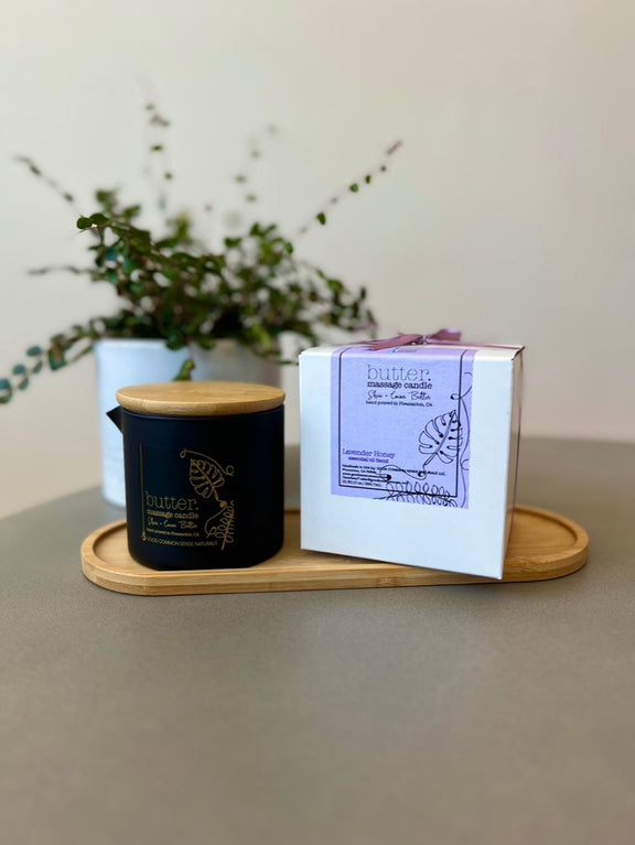 Finally bring home the smells of aromatherapy and be able to use it on your skin. Our Butter Massage Oil Candle is made with fair trade Shea & Cocoa Butters. Along with organic waxes this candle can burn and be enjoyed like a normal candle. When done blow out the candle and our custom made glass jar has a spout to pour the oils onto your skin and take your experience to another level. Smooth skin with butters and enjoy!