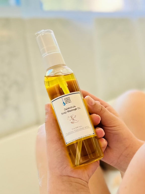 Create your own massage oil for daily moisture or special needs - we hand pour each bottle with the best house blend of ingredients - calendula oil, safflower oil, olive oil, vitamin e.