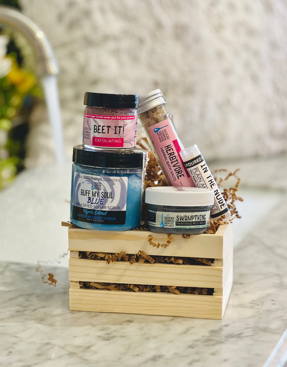 Set includes: Swamp thing 1.5 oz, lip scrub, lip balm, Herbivore Bath Salt tube, 4oz Buff My Soul