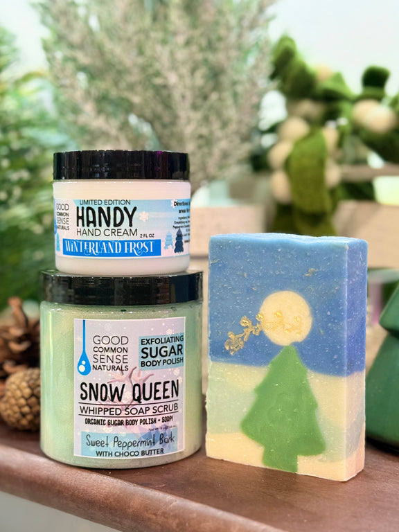 Chill out in style with our frosty-fresh holiday trio. This limited-edition set features Snow Mint To Be soap, Snow Queen soap scrub, and our Winterland Frost hand cream — a cool, refreshing blend that captures the magic of a winter morning. Together, they leave skin soft, smooth, and lightly kissed with icy freshness. The perfect gift for anyone who loves the sparkle and serenity of the season.
